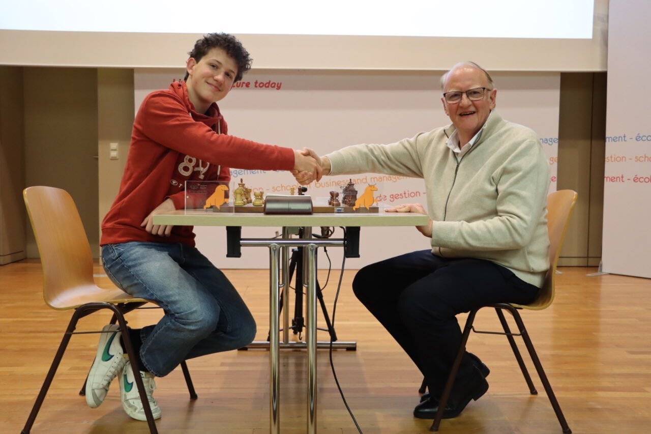 Eise fréiere Professer an der Mathematik, Jean-Paul Schreiner, dee wärend méi wéi engem Véierelsjoerhonnert d’Flam vum Schach am ECG héichgehalen huet, an Honnerte vu Schüler d’Léift zu deem Sport vermëttelt an hinnen d’Finessen dovu bäibruecht huet, ass ugetruede géint den FM Nicolas Bourg, Schüler op der 4e, frëschgebakene FIDE MASTER, dee bei der Club-Europameeschterschaft a Griicheland sechs vu senge siwe Partië gewonnen huet.